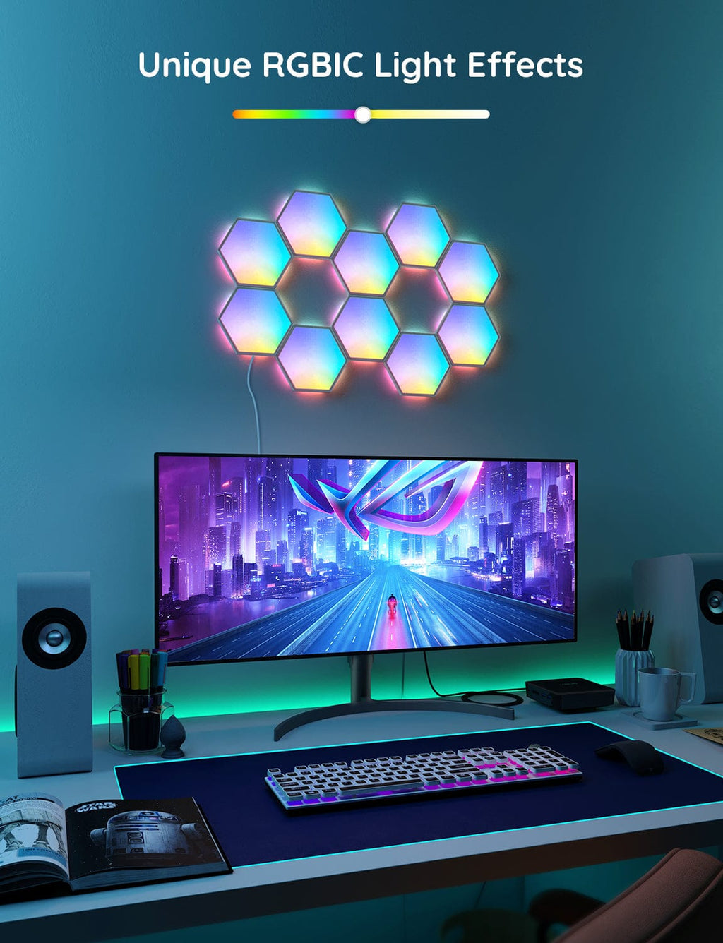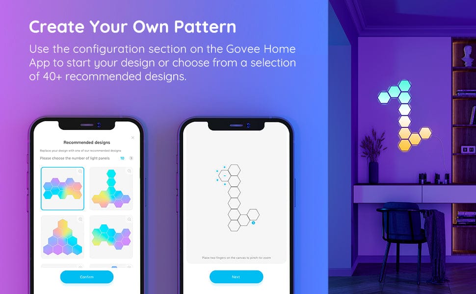 Govee Glide Hexa svetlobni paneli so sestavljeni iz 10 panelov, ki jih lahko poljubno razporedite v različne oblike. Upravljate jih lahko z vašimi najljubšimi glasovnimi pomočniki, kot sta Alexa in Google Assistant, ali prek aplikacije Govee Home. Oblikujte si svoj svet: prilagodite dizajn, učinke, barve in še več.