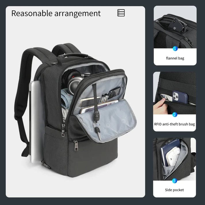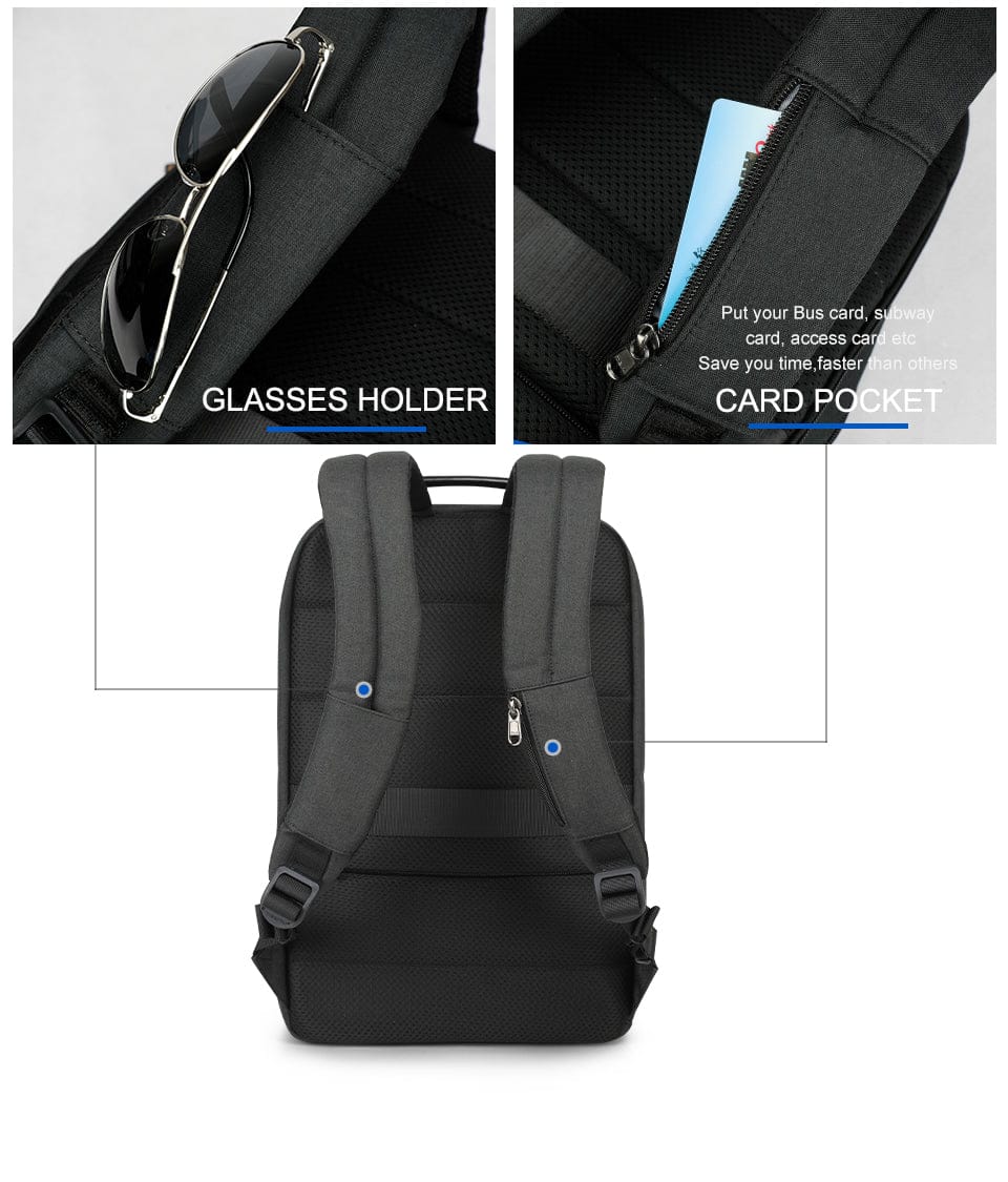 Dodatne značilnosti: Odporen na brizganje vode, polnjenje prek USB-ja, udoben ročaj, dvoslojna ojačana zadrga, izjemno močni šivi, večnamenski skriti zadnji žep varen pred krajo z RFID zaščito, žep z zadrgo na naramnici, trak za pritrditev na ročaj kovčka, dva stranska žepa.